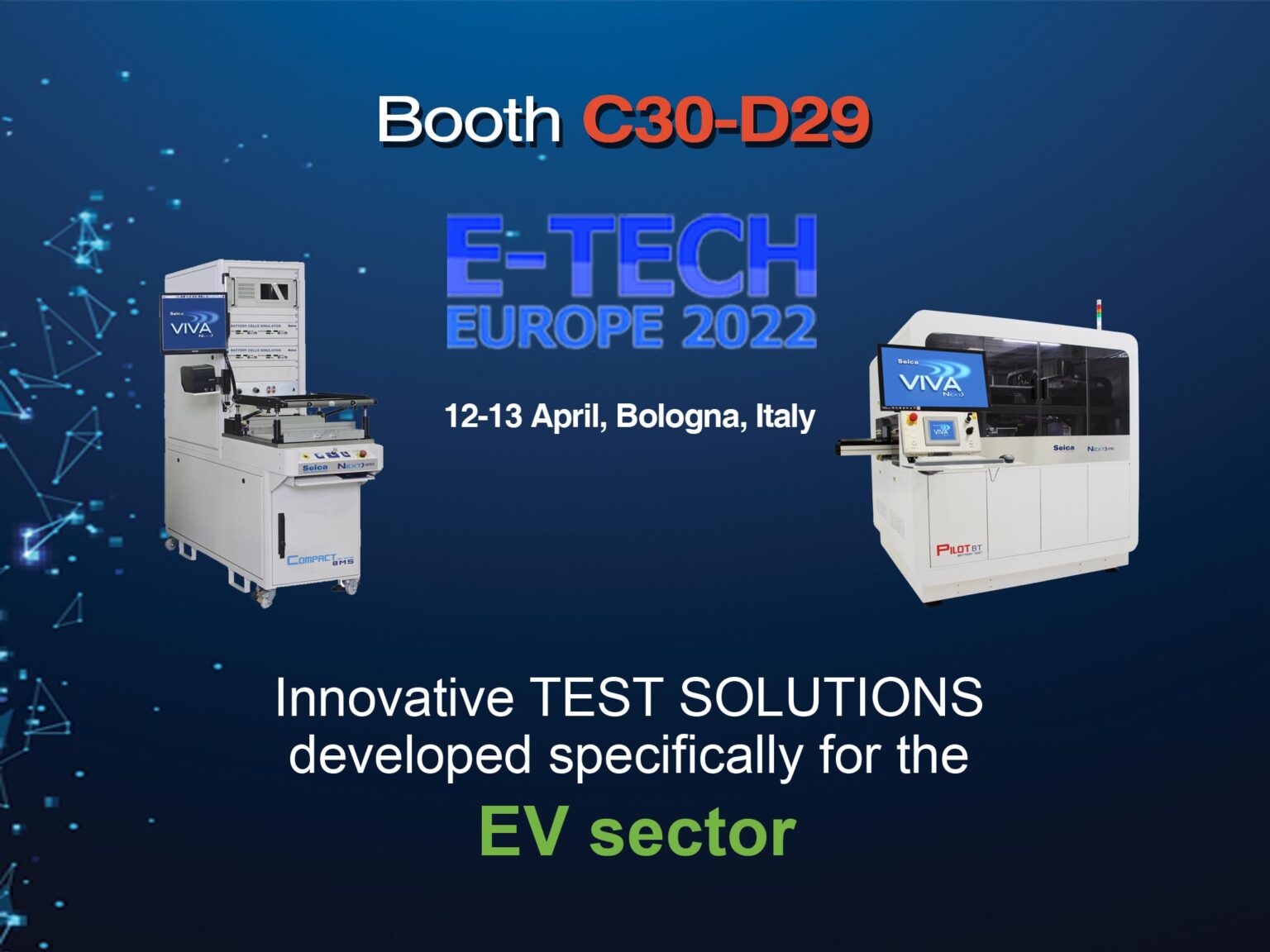 E-Tech Europe 2022已在博洛尼亞開始。 請參觀Seica C30-D29號展臺,接下來兩天將在這里展示PILOT BT和Compact BMS測試系統。