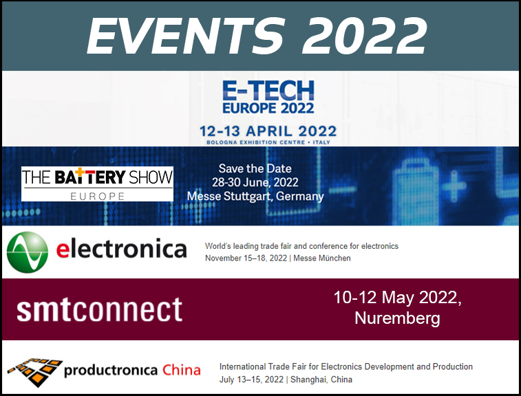 由于Covid-19,活動日歷可能會有一些變化。 E-Tech Europe: 博洛尼亞,意大利, 4月12日至13日, 展位 C30-D29 SMT: 紐倫堡, 德國, 5月10日到12日, 展位 4A-139 PB Technik Meets Friends – Industry 4.0: 波蘭, 5月2...